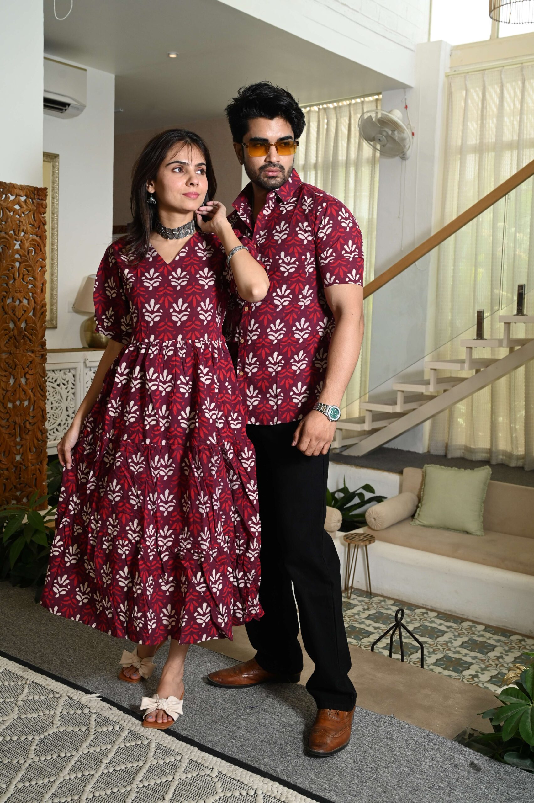 This Maroon matching outfit set includes a women?s midi dress and a men?s short-sleeve shirt, both featuring vibrant red ethnic prints. Perfect for couples who love twinning in style at casual outings, festive gatherings, or vacations.