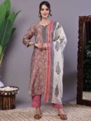 This ensemble is an elegant and vibrant ethnic kurta set, ideal for celebrating festive occasions or for smart casual wear. The straight-cut kurta features an eye-catching, all-over print, beautifully contrasted by a detailed square neckline. This neckline is the focal point, adorned with intricate sequin and zari embroidery that lends a touch of traditional glamour. Paired with crisp, solid white trousers and a coordinating dupatta, the outfit offers a complete, polished look with a comfortable, flattering A-line silhouette and classic 3/4 sleeves. This set perfectly balances traditional artistry with modern wearability.